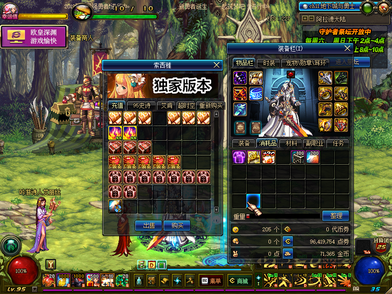 ①:建立角色,对话赛利亚,领取满级经验书 500个赛利亚盒子←这个就是新人福利了,吃下马上95级,系统赠送点卷。